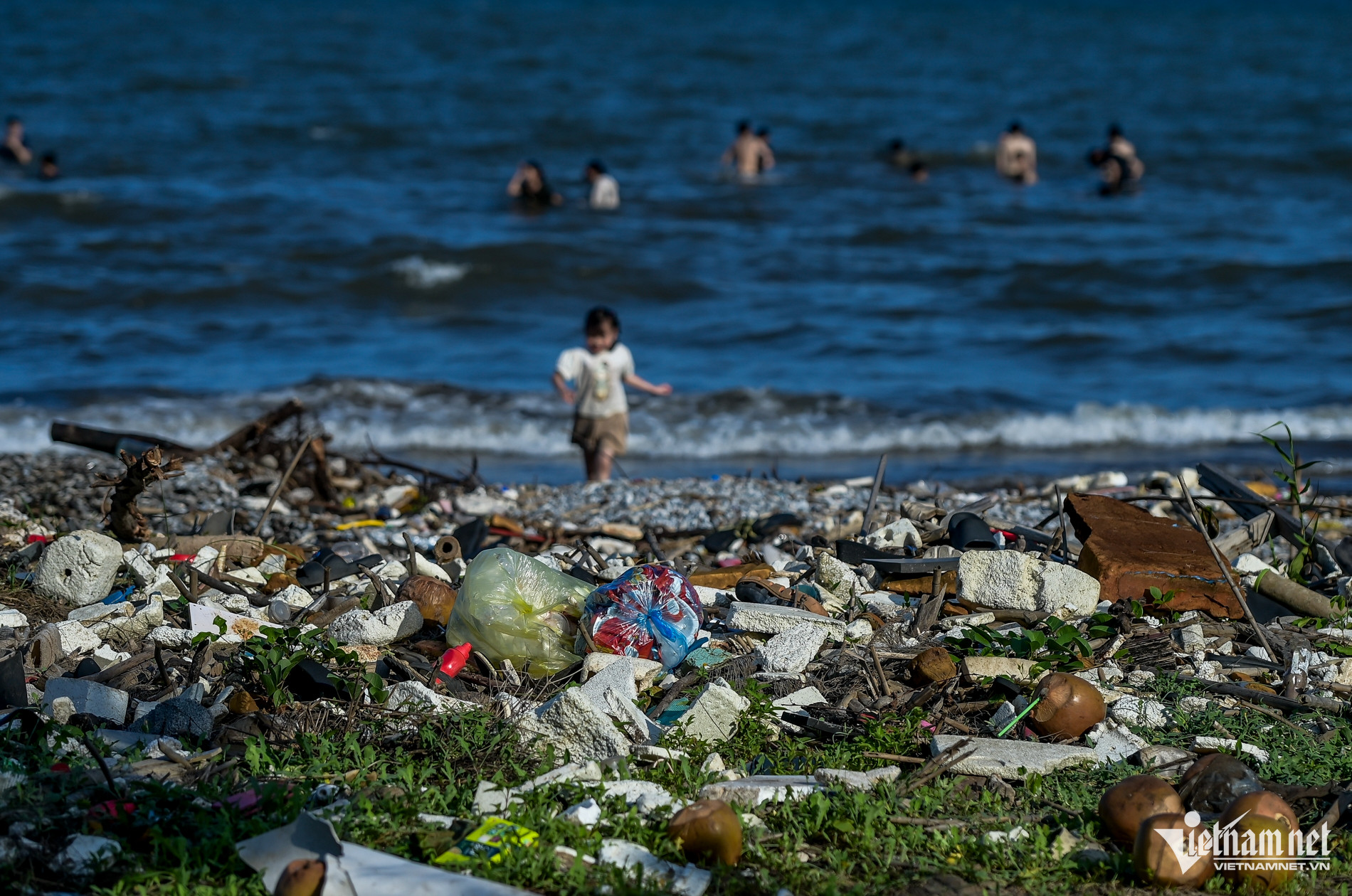 Bất chấp biển cấm, người dân vẫn xuống bãi tắm tự phát ngập rác ở Nam Định