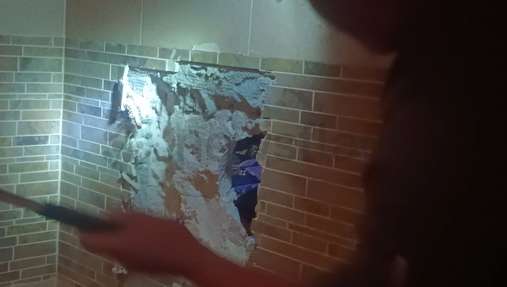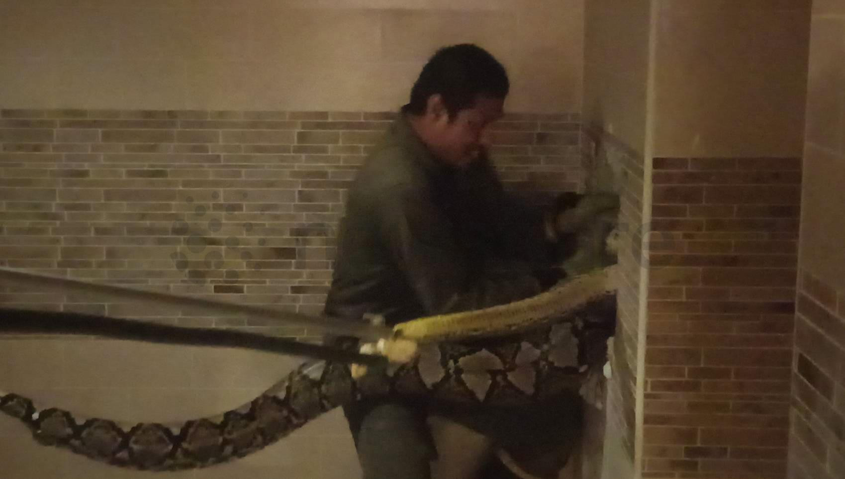 Những hình ảnh được ghi lại từ hiện trường cho thấy các nhân viên chuyên nghiệp đã vật lộn với con vật khổng lồ lẩn trốn trong tường. Họ phải dùng búa đập vỡ bức tường để kéo con trăn ra ngoài.