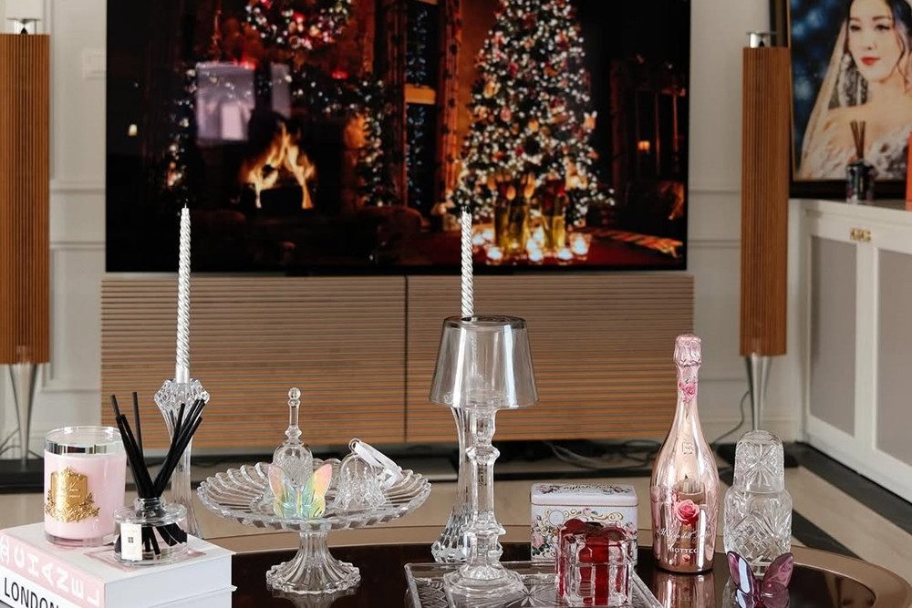 Phòng khách được thiết kế với không gian thoáng đãng, có cửa kính lớn nhìn ra khu vườn. Dù mới chuyển về được vài tháng, á hậu liên tục thay đổi cách bài trí để tạo nên không gian sống hoàn hảo. Trước đó trong dịp Giáng sinh, cô cũng trang trí nhà với cây thông và các phụ kiện Noel.