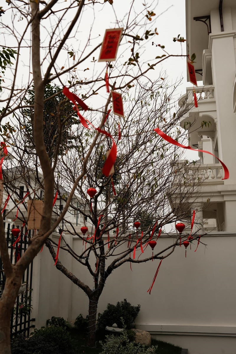 Căn biệt thự 3 tầng với tông màu trắng chủ đạo được Huyền My điểm tô bằng những cành đào thắm cùng đèn lồng đỏ và câu đối. Điểm nhấn đặc biệt của khu vực tiểu cảnh là những cành đào được người đẹp chọn lựa kỹ càng, tạo nên không gian đón Tết vừa hiện đại vừa truyền thống.