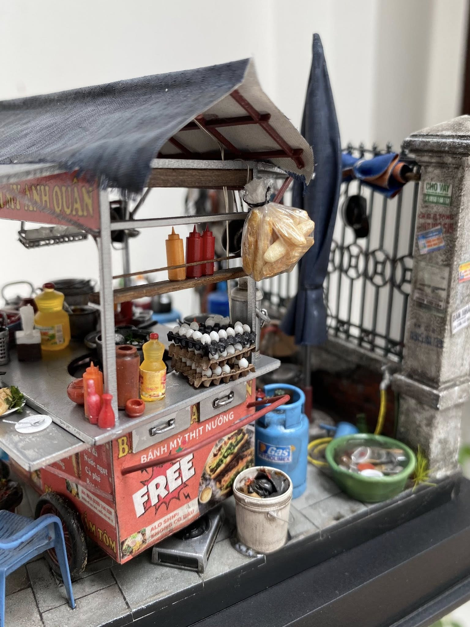 Cường rút điện thoại ra, chụp vài bức ảnh, rồi về nhà tỉ mẩn dựng mô hình theo ký ức và cảm xúc của mình. Dần dần, “vỉa hè Hà Nội”, bộ sưu tập mô hình thủ công của Cường đã ra đời.