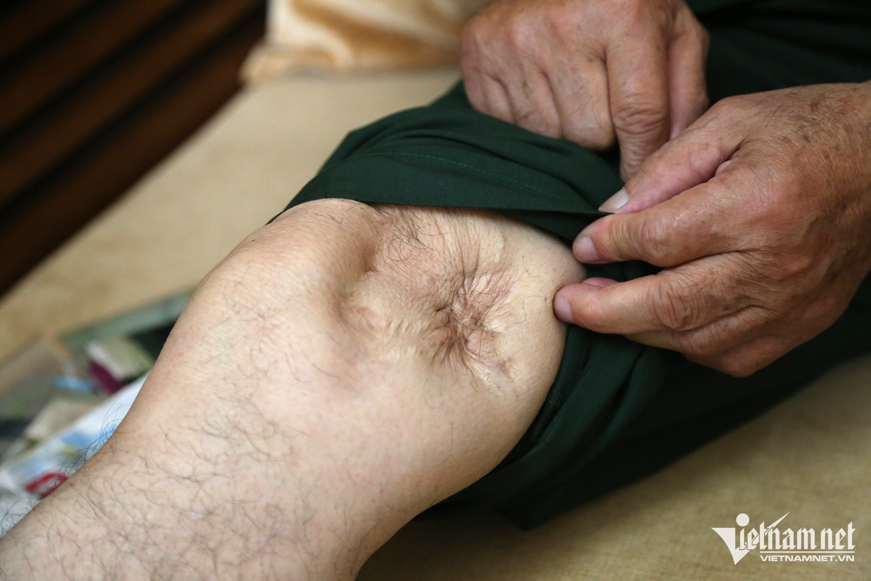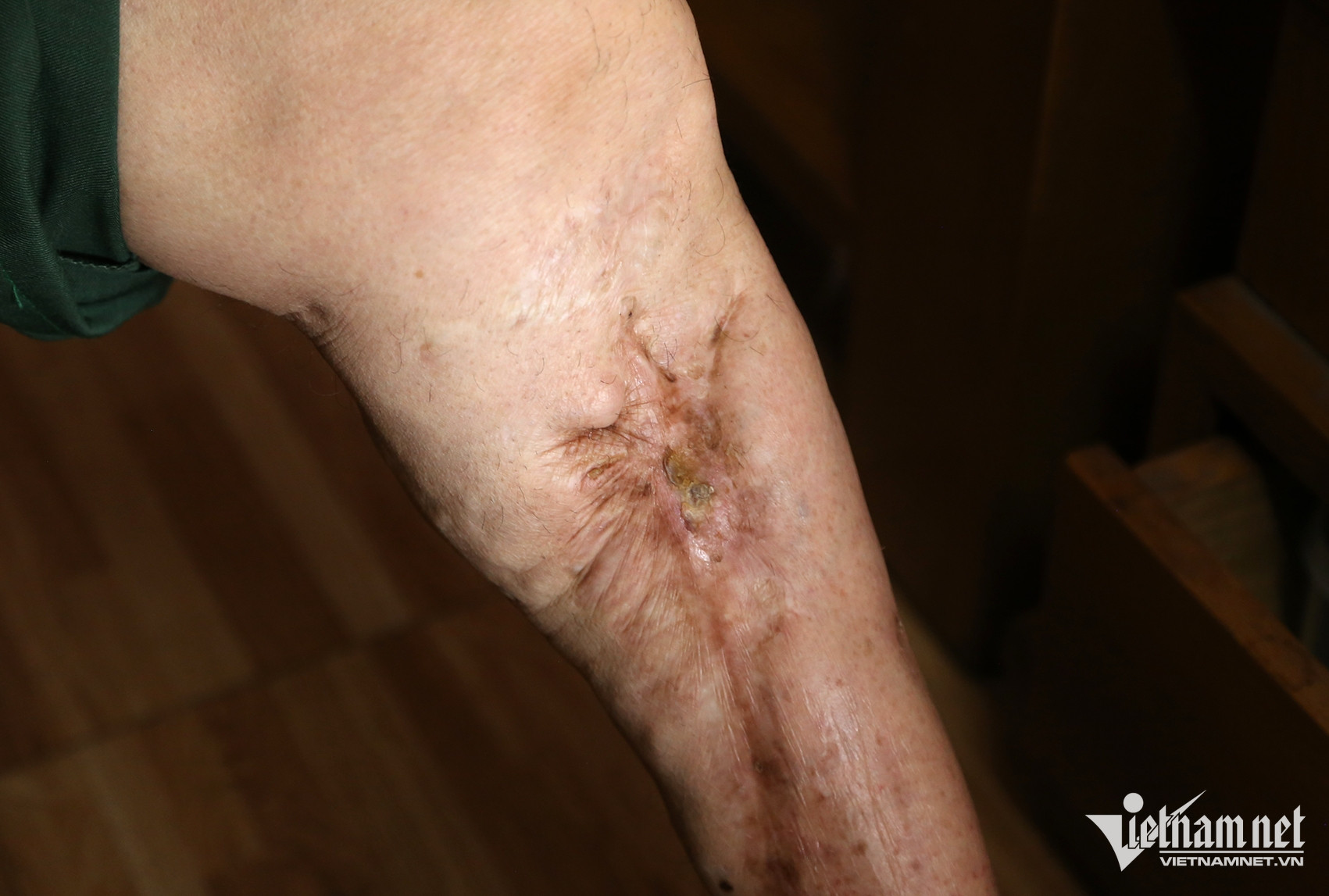 Tại đây, ông Triệu bị thương nặng cả 2 chân phải đi điều trị, đến nay vết thương vẫn hiện vết sẹo lớn khiến ông không thể đi lại bình thường. Những lúc trái gió trở trời, ông phải đi bằng nạng vì hai chân nhức buốt.