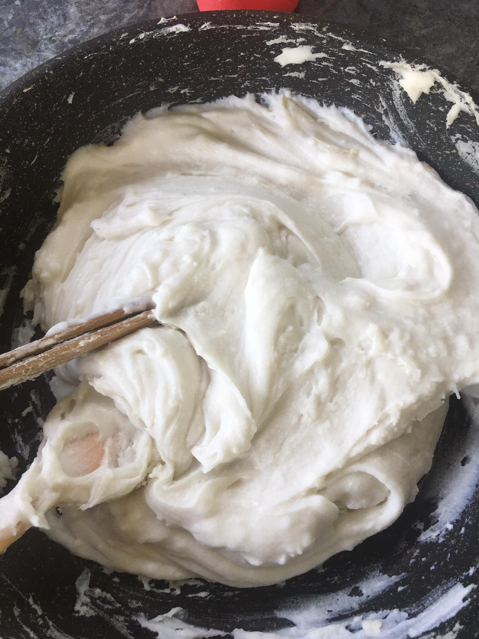 Xay bột xong thì đến công đoạn "ráo bột", tức là đổ bột vào nồi, hòa với lượng nước phù hợp rồi bắc lên bếp, dùng đũa cả đánh cho thật đều tay đến khi bột sánh lại nhưng không bị đổi màu là đạt chuẩn.
