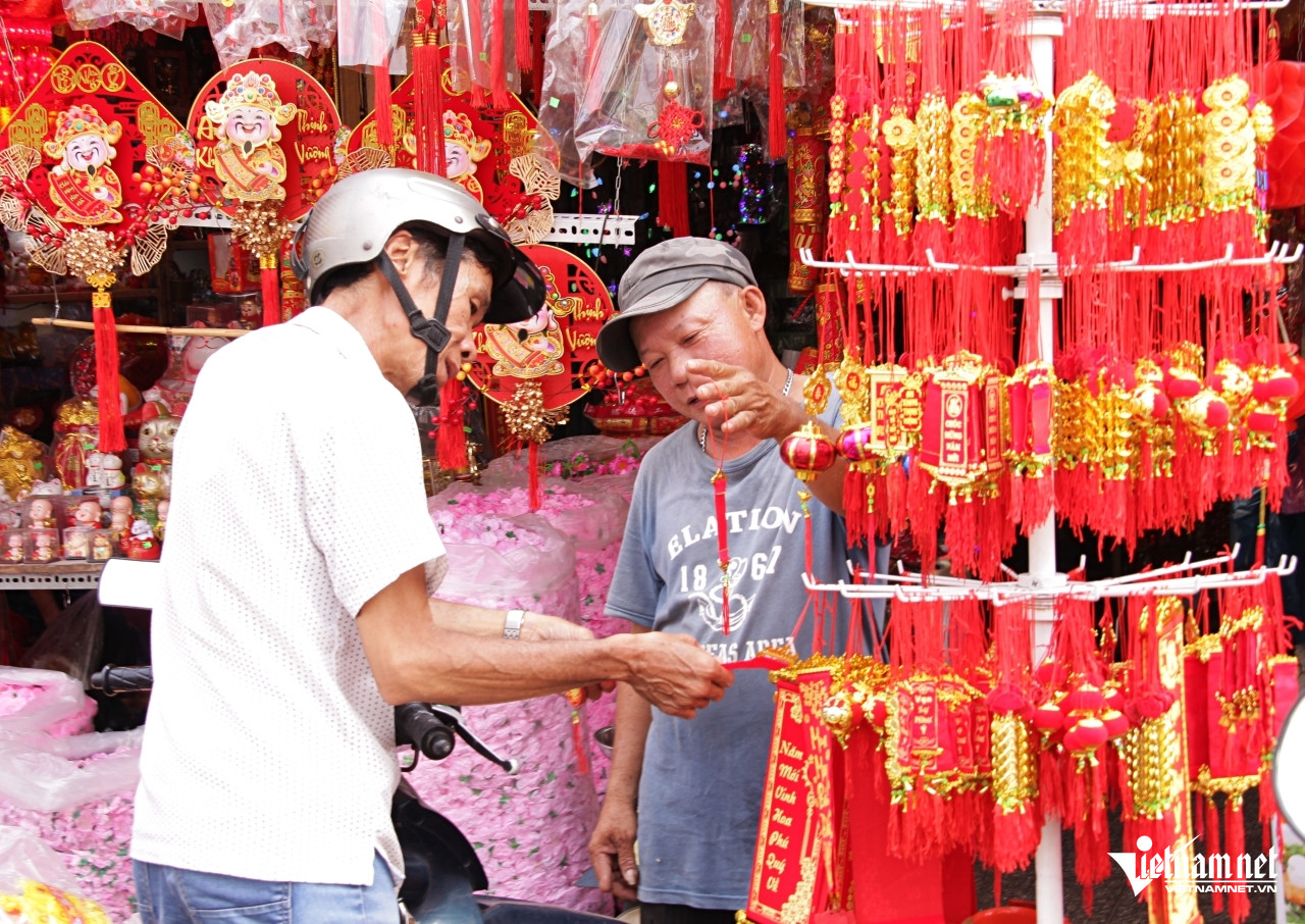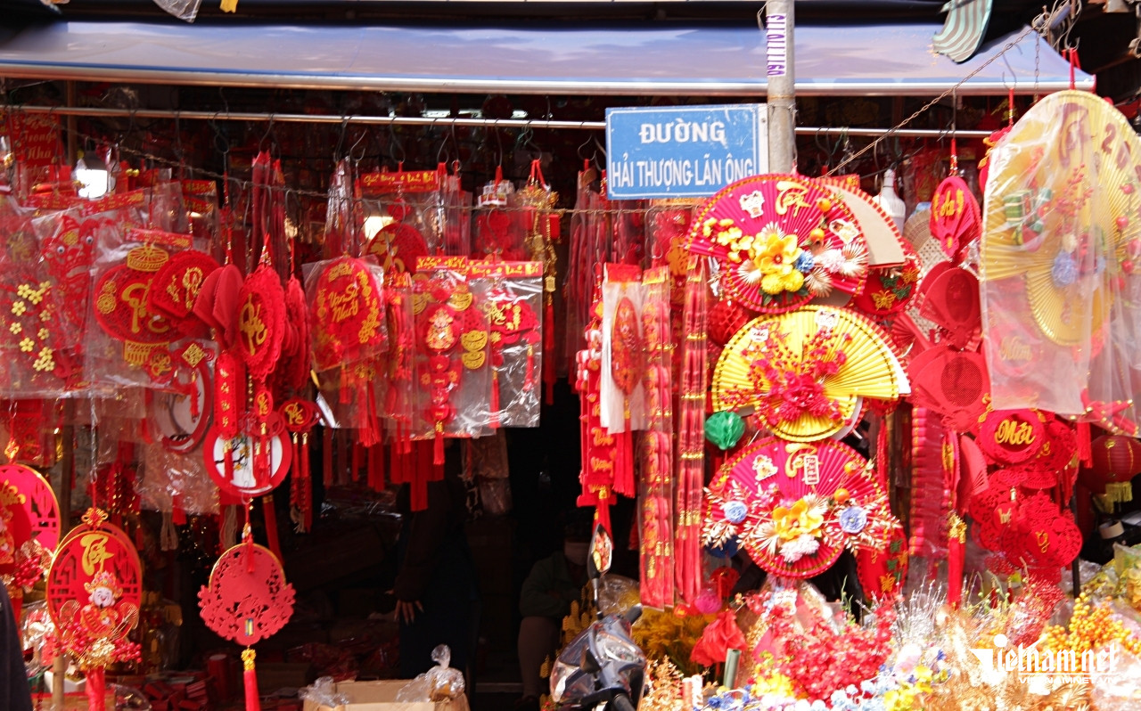 Vì tập trung hàng trăm cửa hàng cùng bán đồ trang trí Tết nên nhiều người gọi vui đây là chợ bán đồ may mắn. Đa số tiểu thương treo, bày đồ trang trí trước cửa tiệm.