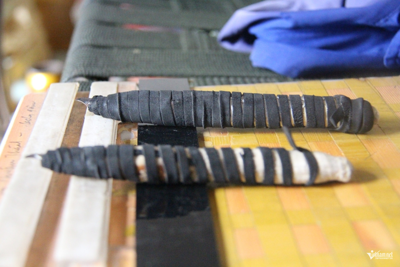 Gần 50 năm qua, ông Long chỉ sử dụng loại bút khắc thủ công do mình tự chế. Gọi là bút nhưng đây chỉ là vật dụng có một đầu sắc nhọn gọi là ngòi khắc.