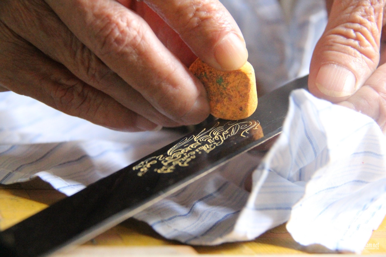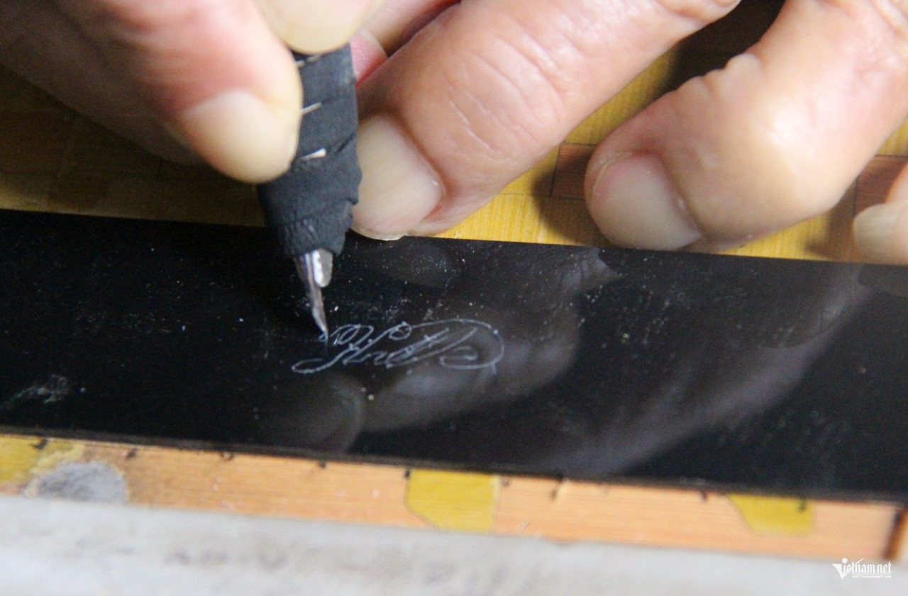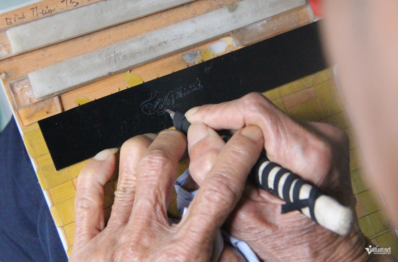 Mỗi lượt khắc chữ, tôi thu từ 5 hào đến 1 đồng. Thu nhập đủ trang trải cuộc sống, nuôi con ăn học. Mấy chục năm sau, chân tôi đau, hoại tử, phải cưa một đoạn.