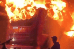 Ngọn lửa xuất phát từ phần đầu xe rồi nhanh chóng bao trùm thân xe. Khói đen cuồn cuộn bốc cao hàng chục mét.