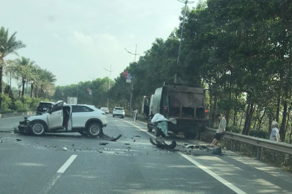 Ô tô con biến dạng sau cú va chạm với xe chở rác ở Hà Nội