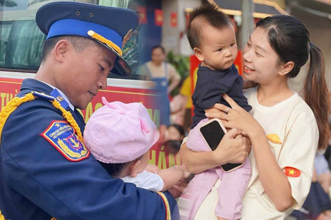 Vợ bế con 9 tháng tuổi chờ chồng diễu binh, giây phút gặp mặt vỡ òa hạnh phúc