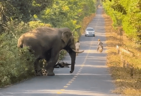Gặp voi 'ngà lệch' đi dạo trên đường, người đàn ông vội bỏ xe máy để chạy bộ