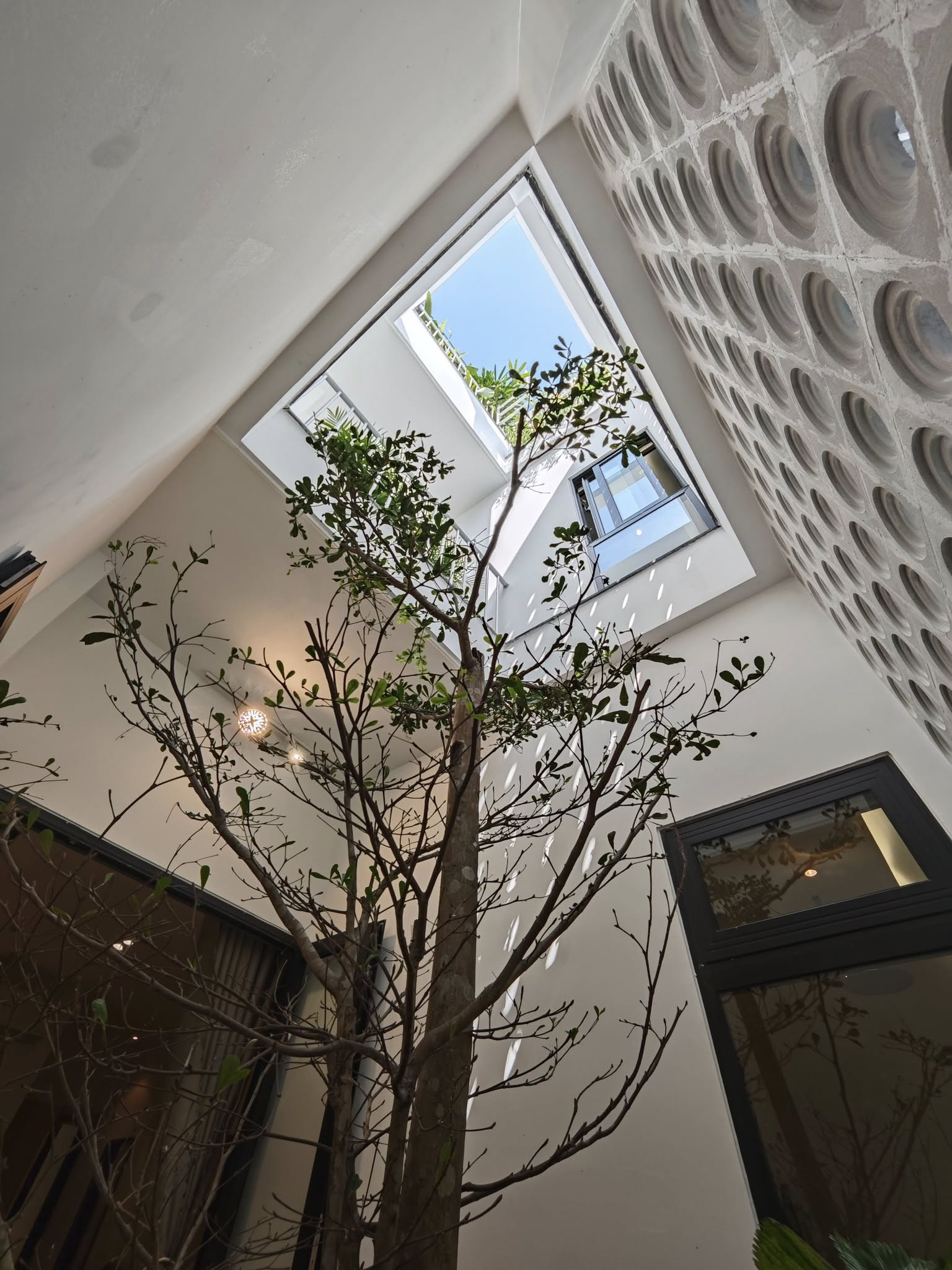 Ngôi nhà thiết kế lệch tầng với 4 tầng sử dụng. Thiết kế này giúp mang tới sự thông thoáng cho ngôi nhà phố sâu nhưng chiều ngang hẹp, giúp các không gian đều đón được nắng và gió. Tầm nhìn giữa các tầng cũng đa dạng, khả năng quan sát và đi lại thoải mái, không nhàm chán.Tầng 1 gồm phòng khách và bếp nối liền. Phòng khách đặt bàn đá mài cách điệu, tạo cảm giác nhẹ nhàng. Phía trước và sau thông thoáng, nhiều ánh sáng nhờ hai khu vườn nhỏ.Gia chủ dành 12m2 trước nhà để làm một khu vườn nhỏ - tạo "màng chắn xanh" với phố phường và một vườn sau kết hợp giếng trời để đón ánh sáng trực tiếp xuyên qua 4 tầng nhà. Ngoài lấy sáng, giếng trời còn tạo sự đối lưu, lưu thông không khí. Trong ảnh là khu vườn phía sau.