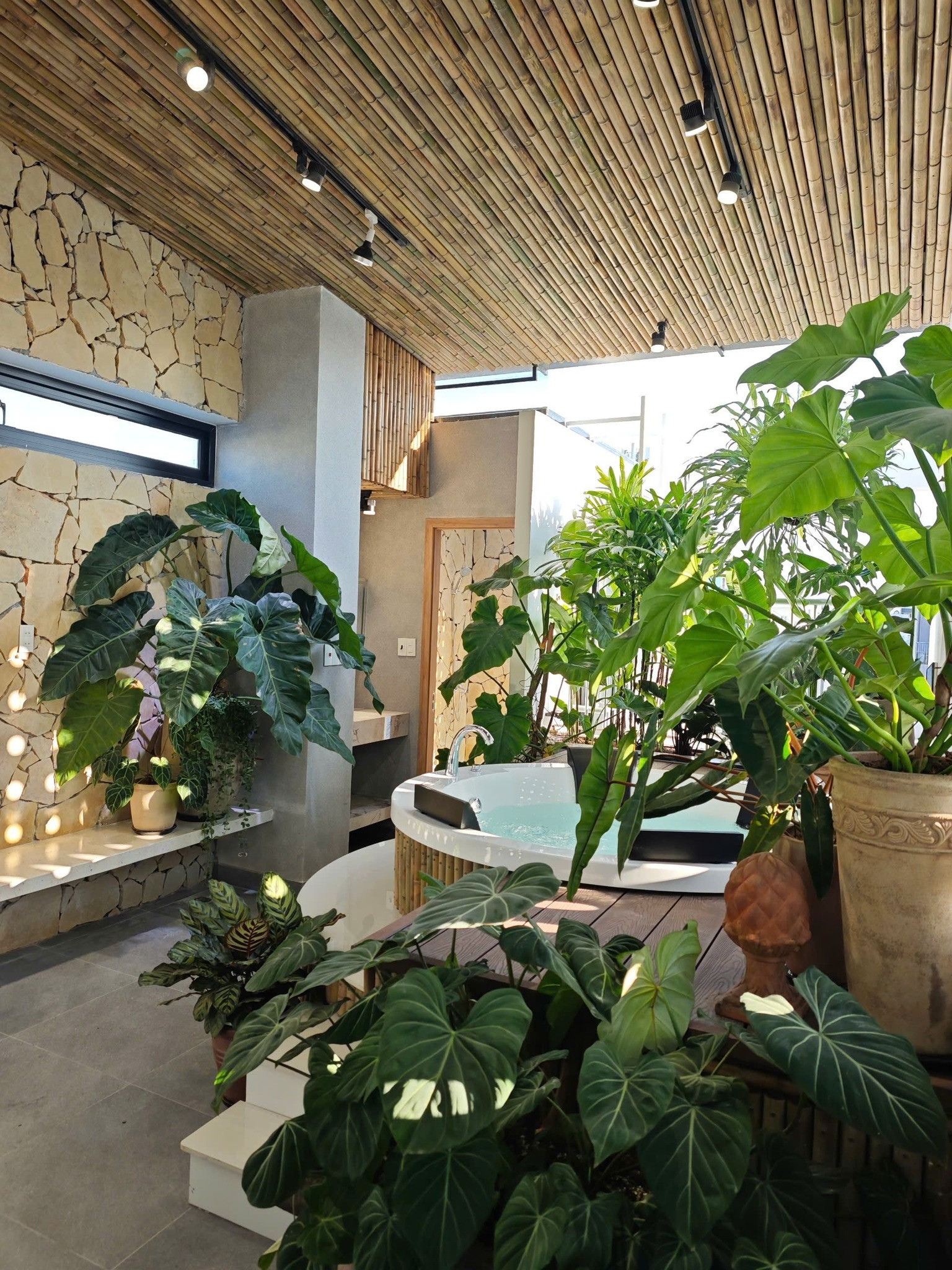 Tầng 4 có một bể sục nước nóng được thiết kế kỳ công và cũng khá tốn kém. Đây là không gian vợ chồng chị Quyên đầu tư để cả nhà thư giãn. Xung quanh bể sục là nhiều cây xanh để tạo cảm giác như "tắm nước nóng giữa núi rừng". "Toàn bộ cây trong nhà đều được lắp hệ thống tưới tự động để đảm bảo cây phát triển tốt, tạo không gian xanh mát", chị Quyên cho biết.